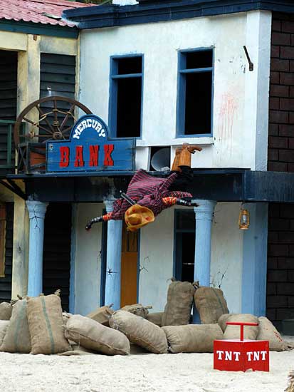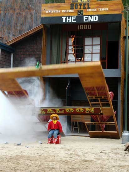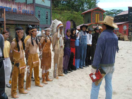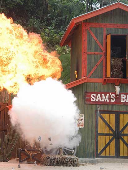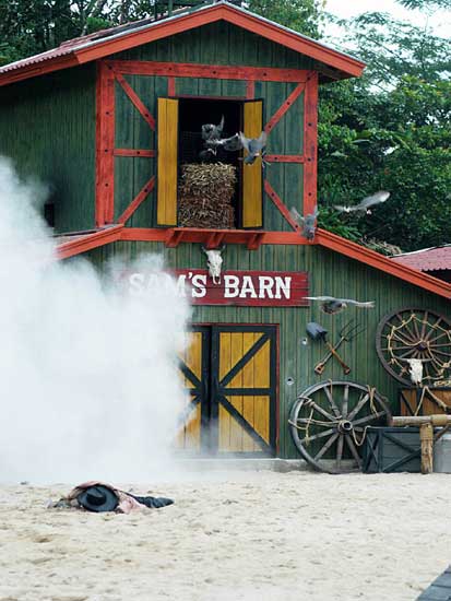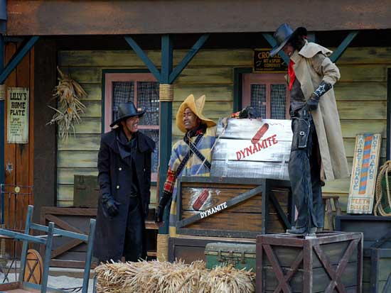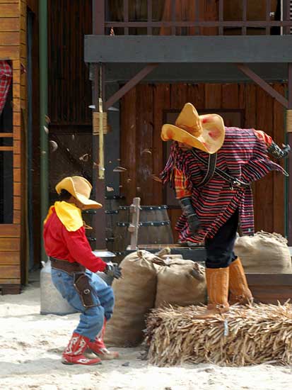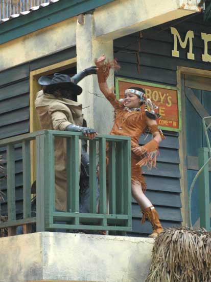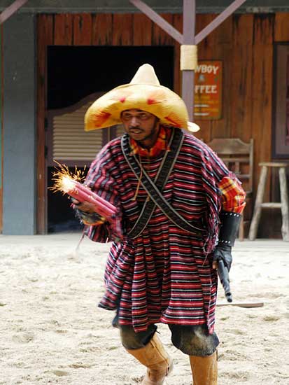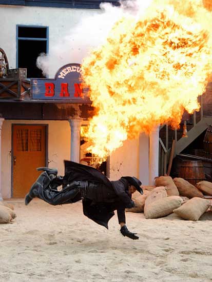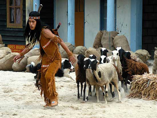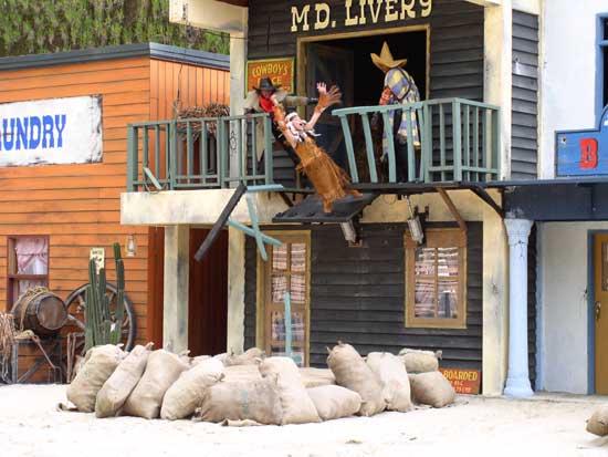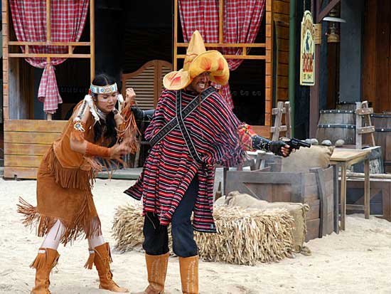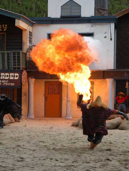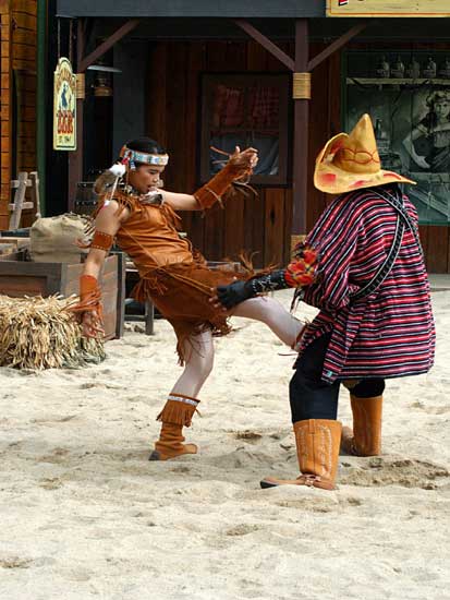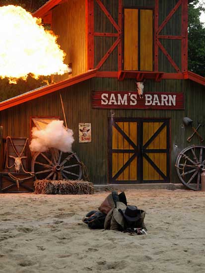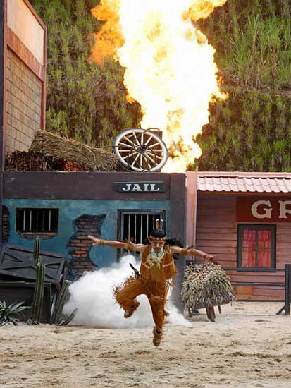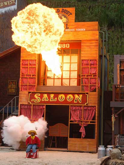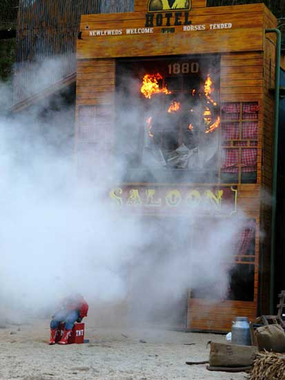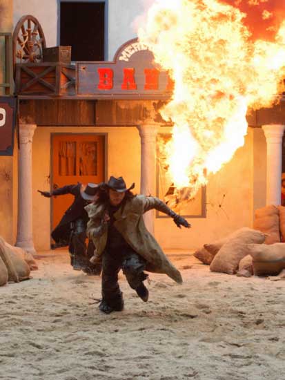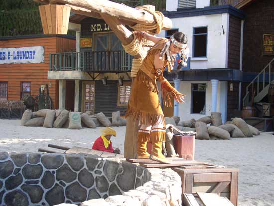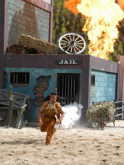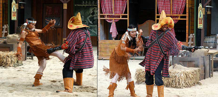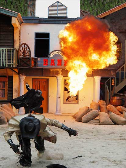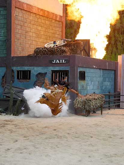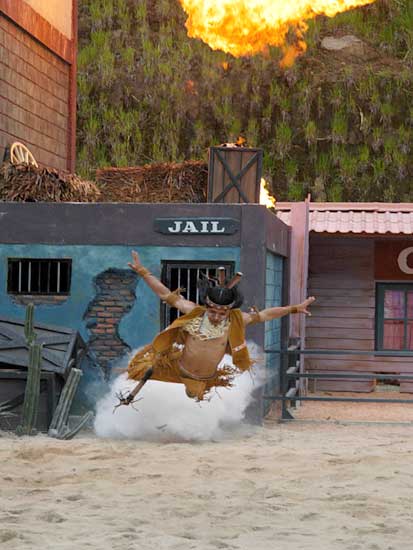 Màn trình diễn pháo hoa sẽ đưa du khách vào thế giới miền Tây hoang dã trong cuộc xung đột giữa những người châu Âu và những người da đỏ. Động vật hoang dã cùng con người tạo nên một kết hợp độc đáo trong việc tạo ra một thành phố hỗn loạn phía tây trong bối cảnh bạo lực đổ máu và hậu quả của một trận chiến khốc liệt. Làm thế nào cuộc sống vẫn tiếp diễn khi kền kền bước đi trên người chết. Linh cẩu ăn thịt người. Tất cả được thực hiện bởi một người diễn viênvới hơn 10 năm kinh nghiệm đóng thế chuyên nghiệp trong những pha nguy hiểm. |